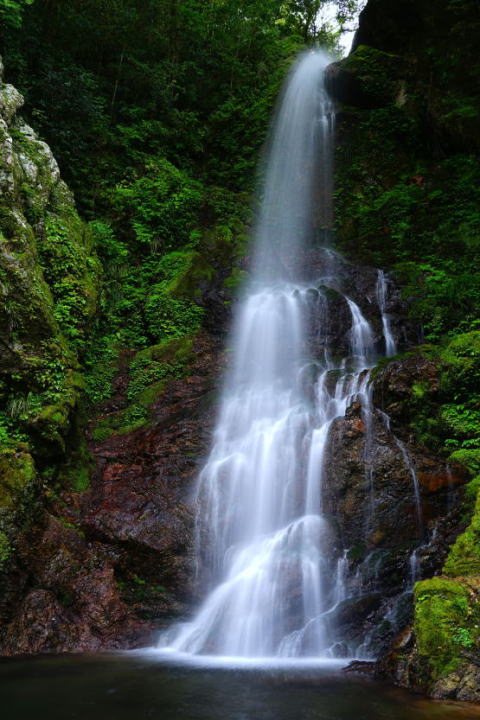 県道17号線を大川村役場から西進します。 井野川との合流点を過ぎて少し行くと滝の案内表示があり、 それに従い右の林道へと進みます。 約1.4kmで写真の「大平新橋」があり、 その脇の旧道から奥に滝の一部を見ることができます。