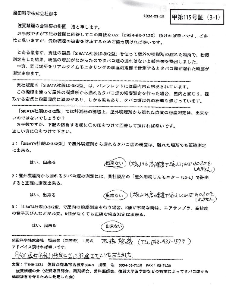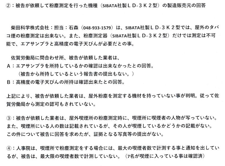 この件について、小松市長は、木原奉文県議会議員に調査を依頼(佐賀県環境科学検査協会:0952-22-1651)した結果「タバコ煙の漏れはない」と発表。→ これは捏造と判明:↓ 木原奉文県議会議員が測定に使用した粉塵測定器( LD-3K2型)では、製造元の(柴田科学株式会社:担当:石森)や佐賀労働局(担当:クワハラ氏)も、計測不可能と回答
