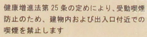2024年09月16日:愛媛県の「みかん専門店」に立ち寄った際、前回の時は、灰皿が設置してあったが愛媛県の指導により、駐車場を含めて敷地内禁煙になっていました。厚労省は2000年に、将来の悲劇を避けるため、屋内外すべてで受動喫煙対策をするように通知(健康日本21) |