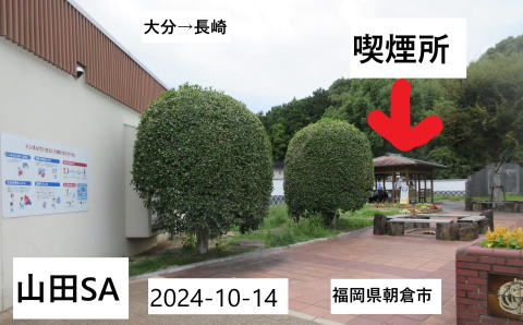 2024-10-14 山田SA(大分→長崎) 屋外喫煙所まで十分な距離がある。 トイレからも離れている。 しかし、3次喫煙防止は出来ない。 厚労省;2018年通知 |
