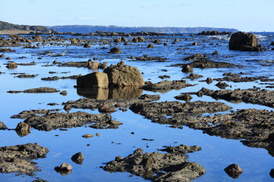 大小様々なサイズの岩が一部地面に埋まったままみえています。これは地震などで発生した海底の土砂崩れ(海底土石流)によって運ばれた泥と崩れた岩が一緒に固まった地層です。泥の部分が波の浸食で削られている途中で、岩はまだ地中に残っているため、このような不思議な景観になっていると考えられています。