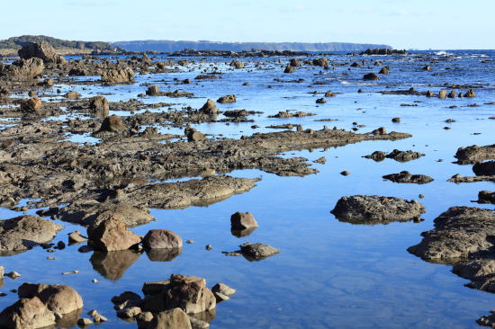 串本町田子の海岸には、平らな磯に大小の岩を散りばめたような地層があります。地面から顔を出しているように見えることから地質の専門家が「サラシ首層」と名付けました。岩はころがっているのではなく、下の岩盤とつながっています。潮が満ちてくると不思議な光景が広がります。