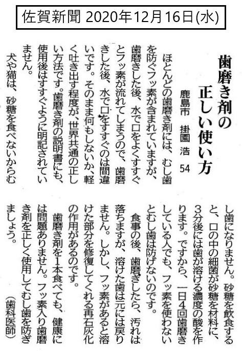 | 佐賀新聞掲載 歯磨剤の正しい使用方法 ほとんどの歯磨剤には、むし歯を防ぐフッ素が含まれていますが、歯磨きした後、水で口をよくすすぐとフッ素が流れてしまうので、歯磨きした後、水で口をすすぐのは間違いです。そのまま何もしないか、軽く吐き出す程度が、世界共通の正しい方法です。 歯磨剤の説明書にも、使用後はすすぐように明記されていません。 犬や猫は、砂糖を食べないからむし歯になりません。砂糖を飲食すると、口の中の細菌が砂糖を材料に3分後には歯が溶ける濃度の酸を作ります。ですから一日4回歯磨きしている人でも、フッ素を使わないとむし歯は防げないのです。 食事の後、歯磨きしたら、汚れは落ちますが、溶けた歯は元には戻りません。しかし、フッ素があると溶けた部分を修復してくれる再石灰化の作用があるのです。 歯磨剤を1本食べても健康には問題ありません。フッ素入り歯磨剤を正しく使用してむし歯を防ぎましょう。 |