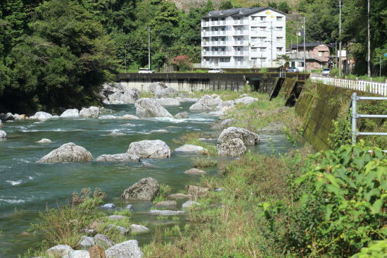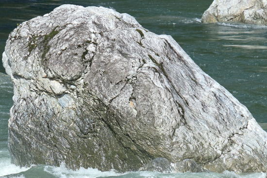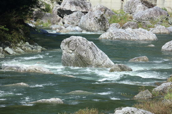 194号線沿いの仁淀川の支流「上八川川」の中央付近に衝立 のように立つ岩
