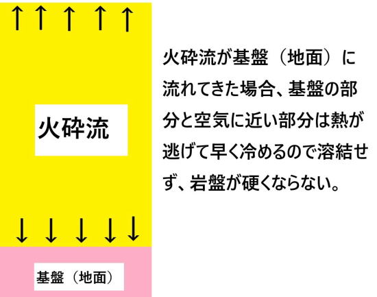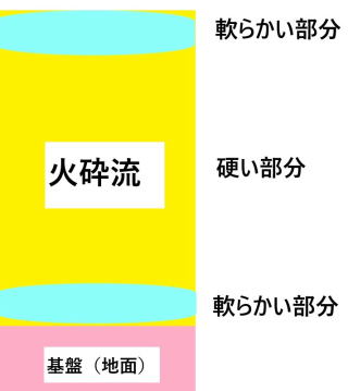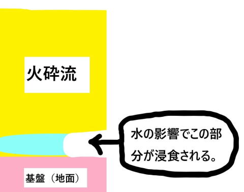 軟らかい部分が水で浸食されて、自重(岩盤の重さ)で岩壁が崩壊して