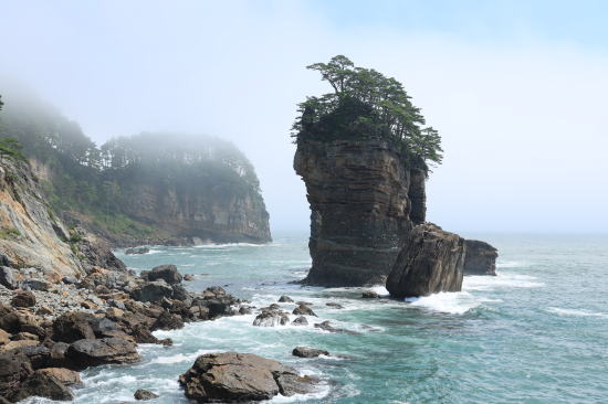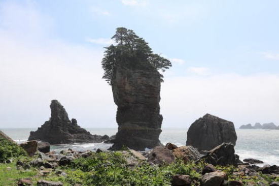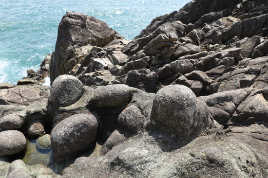 田老花崗岩は比較的浅いところでマグマが冷えて固まってできたため、 鉱物の大きさが揃っていません。田老花崗岩は冷えるにつれ収縮して 数方向にひび割れしてブロック状になっています。ひびにしみ込んだ水 はブロックの中心に向かって風化を進めます。ここではブロックの 中心部が球状に残っているたまねぎ状風化が見られます。 三王岩 | 宮古ジオパーク (geopark-miyako.com)