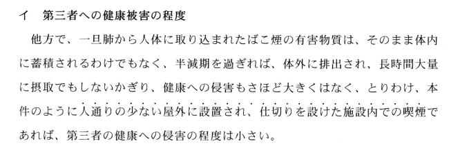 2:事実関係の確認 被告は肺から人体に取り込まれたタバコ煙の有害物質は、そのまま体内に蓄積されるわけでもなく・・・略)・・・半減期を過ぎれば、体外に排出され・・と明記している。 ①:タバコ煙に含まれるニコチン(約1mg)は、約40分程度で、コチニンという物質に変化します。そして約1週間で毛髪などを除いて排出されます。 一方②:タバコ煙に含まれる発癌物質(0.5~1mg)は、人の遺伝子と共有結合してDNA付加体となります。これが問題なのです。1999年、不妊で悩む男性の精子をDNA検査するとタバコ由来の発癌物質(タバコ特異的ニトロソアミン)が精子のDNAを損傷しており、重度の場合には不妊に、軽微な場合には障害児へと繋がります。(甲第02号証:厚労省研究班発表) 今までに、タバコ由来の発癌物質(タバコ特異的ニトロソアミン)やその他の発癌物質がDNA付加体となった場合、それが排除させるという報告書を見た事がありません。 (以上が下記Aに対する原告の科学的根拠です。) -------------------------------------------------------------------------------------------------------------- A:被告は、「第三者への健康被害の程度「タバコの有害物質はそのまま体内に蓄積されるわけでもなく・・・」と明記されているが、その研究発表は被告が試験管などを使って自ら実験を行ったのか、或いは被告の妄想なのか、その科学的根拠を示して頂きたい。 B:被告は本件のよう人通りの少ない屋外に設置され・・(略)・・第三者への健康被害の侵害の程度は小さい。と明記されているが、その研究発表は被告が試験管などを使って自ら実験を行ったのか、或いは被告の妄想なのか、その科学的根拠を示して頂きたい。 ------------------------------------------------------------------------- 原告のBの科学的根拠について ①:被告の屋外喫煙所は厚労省の2019年の新基準を満たしていない。(甲第03号証) ②:被告の屋外喫煙所は人通りが多い。(甲第04号証) ③:厚労省は、被告に対して、第一種(武雄市役所)は原則敷地内禁煙。喫煙所の設置は勧めない。敷地内禁煙でないと3次喫煙を含めて受動喫煙の健康被害は防げない。屋外喫煙所で受動喫煙の健康被害が生じた場合には、厚労省の通知を無視した武雄市長がすべて責任を取りなさい。との回答。厚労省:(03-5253-1111(内)1111) 武雄市役所(自治体)は、敷地内禁煙にして、見本となり、それを民間にも実施するように 例:長崎県松浦市(甲第05号証)、唐津市(甲第06号証)、鹿島市(甲第07号証) ④:たった一個の発癌物質がDNA付加体となり、ラミン遺伝子Aの1824番目がCがTに変わると発病。(甲第08号証) |