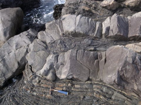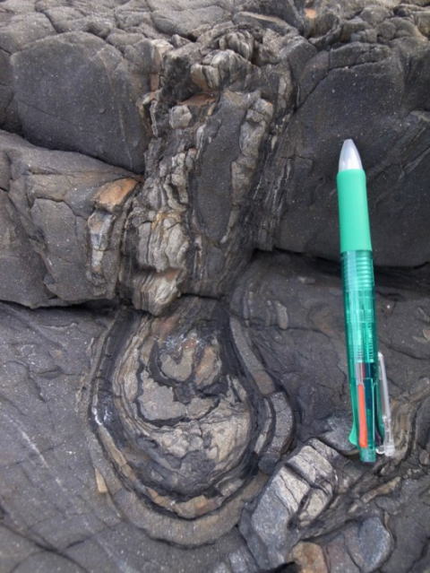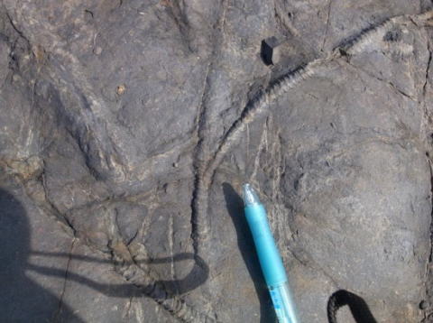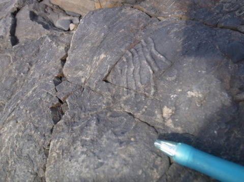 地層以外に、生痕化石もあります。これは二枚貝が這った痕。