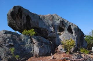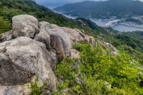江田島市、東能見島の陀峯山(だぼうさん)の中腹に位置する「天狗岩」。陀峯山山頂に続く狭い山道を登り、駐車スペースから少し歩くと景色が開け、不思議な岩場の空間が広がる。大きな一枚岩のてっぺんから望む、早瀬大橋をはじめとした瀬戸内の風景は爽快そのもの。 |