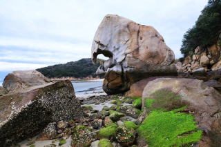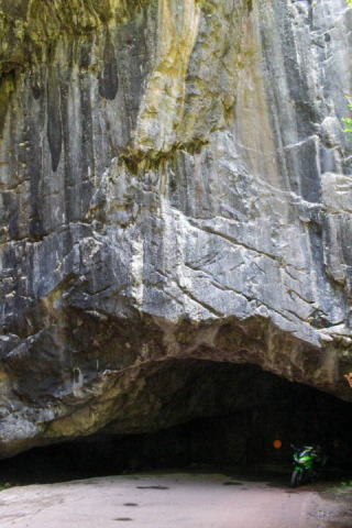高梁市の羽山渓を通る、県道300号宇治下原線の「羽山第二隧道」。ここは大きな石灰岩をくり抜いた迫力満点の素掘りトンネル。県道300号のこの付近は、石灰岩がオーバーハングして道路に張り出した「片洞門」などの見所が多い