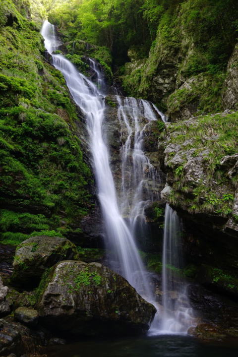 県道17号線を大川村役場から西進します。 井野川との合流点を過ぎて少し行くと滝の案内表示があり、 それに従い右の林道へと進みます。 約1.4kmで写真の「大平新橋」があり、 その脇の旧道から奥に滝の一部を見ることができます。