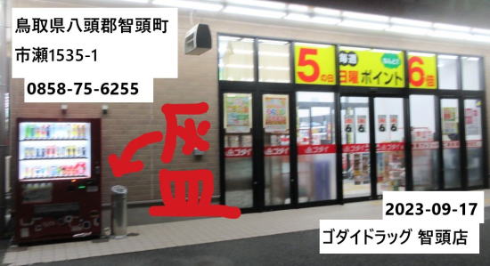 | 鳥取県八頭郡智頭町大字市瀬1535−1 0858-75-6255 ゴダイドラッグ智頭店 |