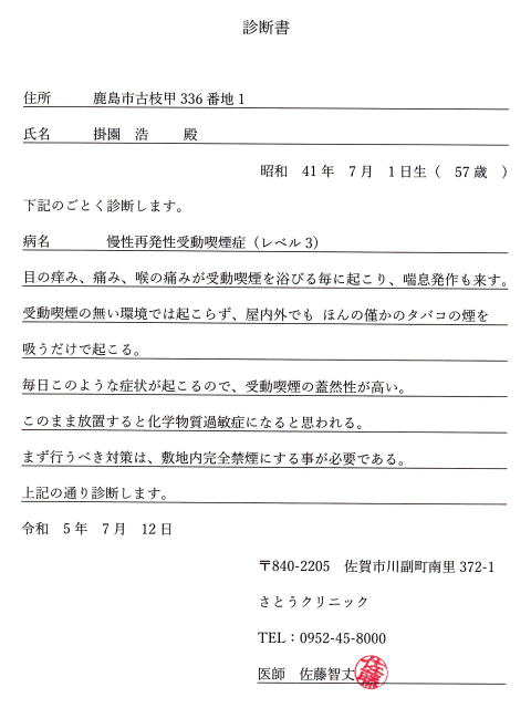診断書 病名:慢性再発性受動喫煙症 (レベル3) 受動喫煙症診断基準 (jstc.or.jp) |