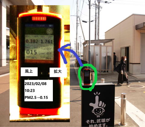 @:計測場所 それ、武雄が始めます。 の看板の上 10:23 PM2.5→ 0.15 風上 晴れ 風上での計測をバックグランドとする。喫煙所には常に喫煙者がいるので、喫煙所内では計測出来ない。 |