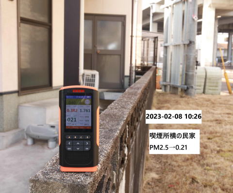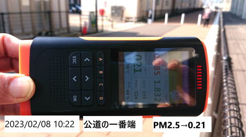 A:屋外喫煙所の横の道路の一番端の金網の所 10:22 PM2.5→0.21 風下 晴れ |