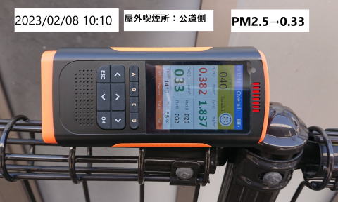 B:屋外喫煙所の真横の金網の所 10:10 PM2.5→0.33 風下 晴れ |