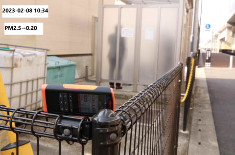 A屋外喫煙所の金網の一番端の所 10:34 PM2.5→0.20 風下 晴れ |
