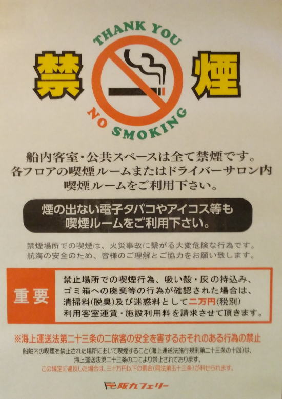 ※船舶内の禁煙区画での喫煙(海上運送法施行規則第23条の14)は、海上運送法第23条の二により禁止されております。この規定に違反した場合は、30万円以下の罰金(同法第53条)が科せられます。 また、禁煙区画での喫煙が発覚した場合には、客室の脱臭・クリーンアップ費用2万円の他、その他損害費用(利用できない期間の施設使用料)をご負担いただきます。