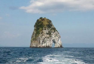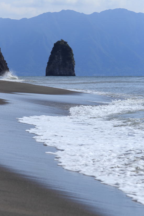 竹山の南に浮かぶ俣川洲は,竹山と同様にできた火山の名残だ。海水で削られたトンネル(海食洞)がポッカリと空いており,その大きさは小舟が通り抜けられるほど。江戸時代にはすでに,「俣川洲」と表記されていたようだ。「俣」は川や道が2つに分岐する所を,「洲」は川の中州,転じて陸地の意味をもつ漢字。俣川洲は,“人の股のようjな形をした水の流れる海にある陸地”といった意味なのかもしれない。