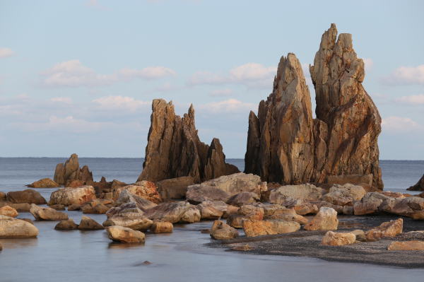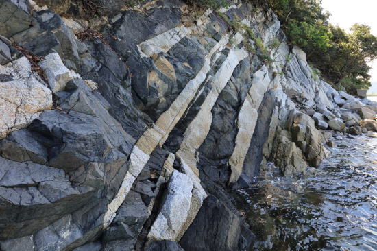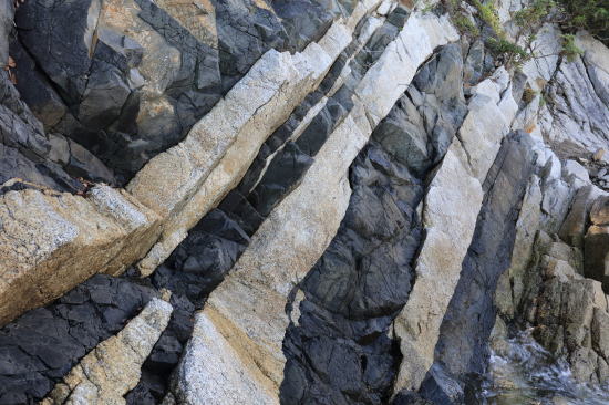 ランプロファイア岩脈は、白色の花崗岩(かこう岩)に節理(割れ目)ができた時に、黒色のランプロファイアが入り込んで、白と黒の縞模様ができた地質名所です。