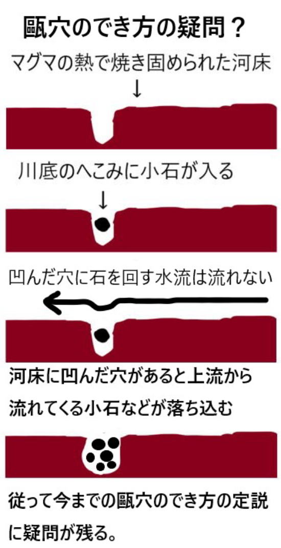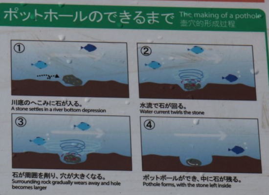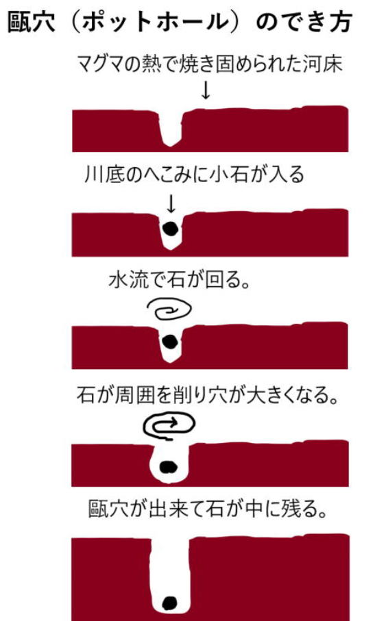 | 甌穴の形成について現地や地学の解説書には下記のように記述されています。 |