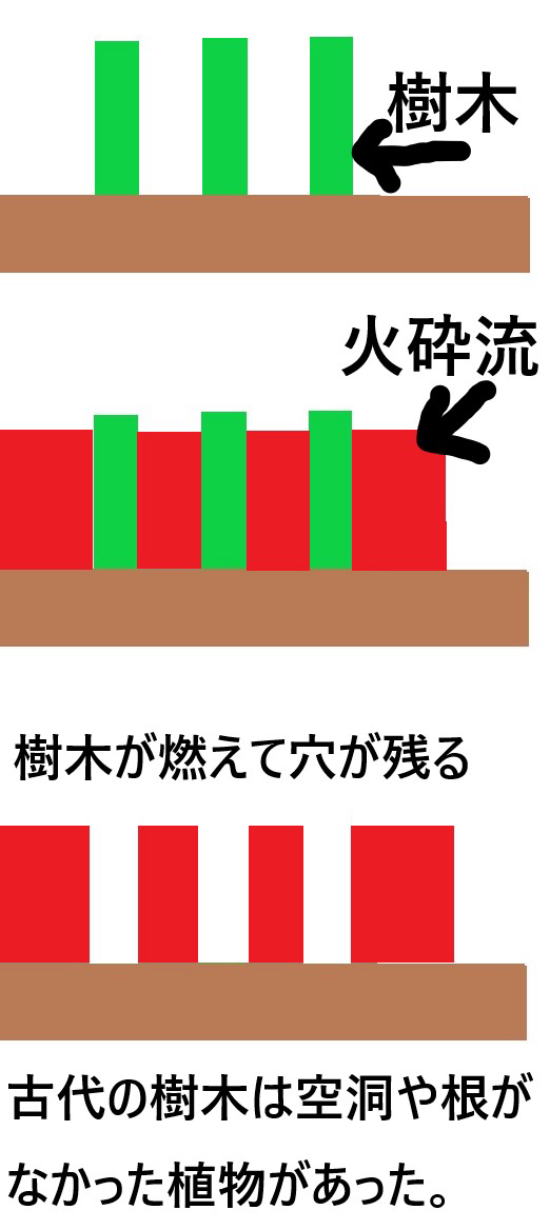 場所に火砕流が流れ込み樹木を燃やした後の空洞と考えると説明がうまく