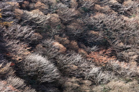2022-11-03 大分県:九重:三俣山 タイトル「晩秋の樹木」 山の斜面と同じ角度で太陽光が降り注ぐ時、葉が落ちた樹木の枝が鏡のように光を反射して白くなり、その下は光が入らないので黒くなる。 そのため白と黒のコントラストが強調されこのような写真になる。 太陽の角度が異なるとこの現象は現れないので、私もこれ程きれいに見るのは初めてです。 |