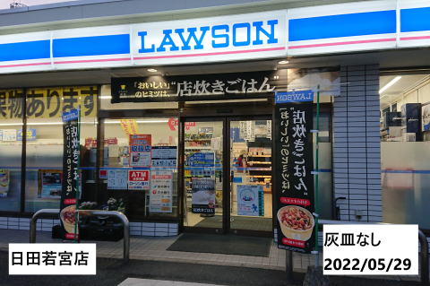 2022/05/29 ローソン 日田若宮店 灰皿なし 店員に尋ねた所「灰皿設置なし」 来客や職員の健康のため、敷地内禁煙 |