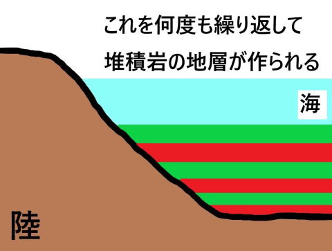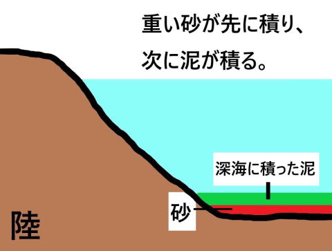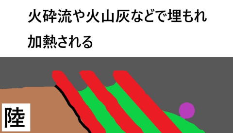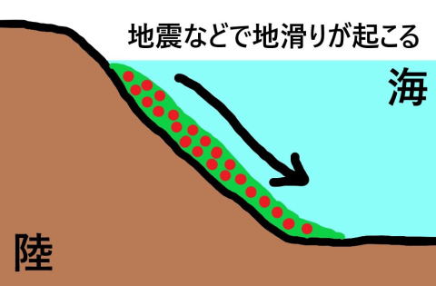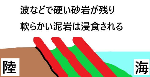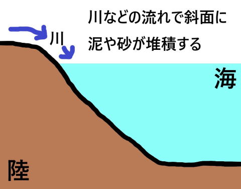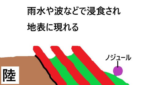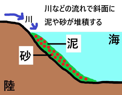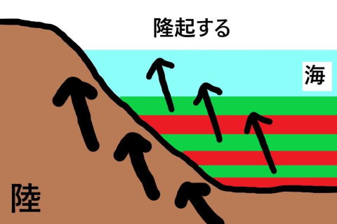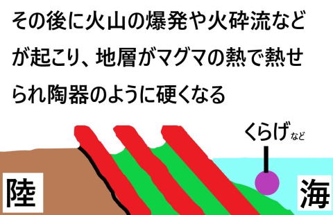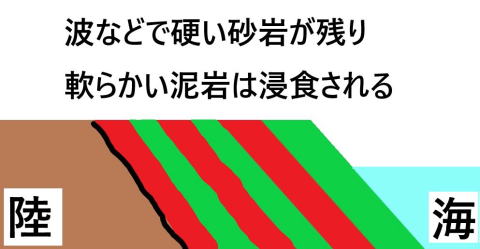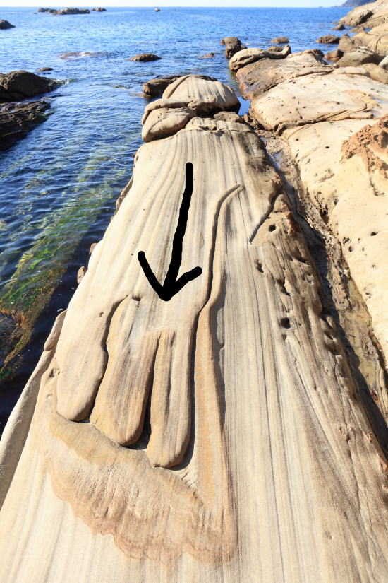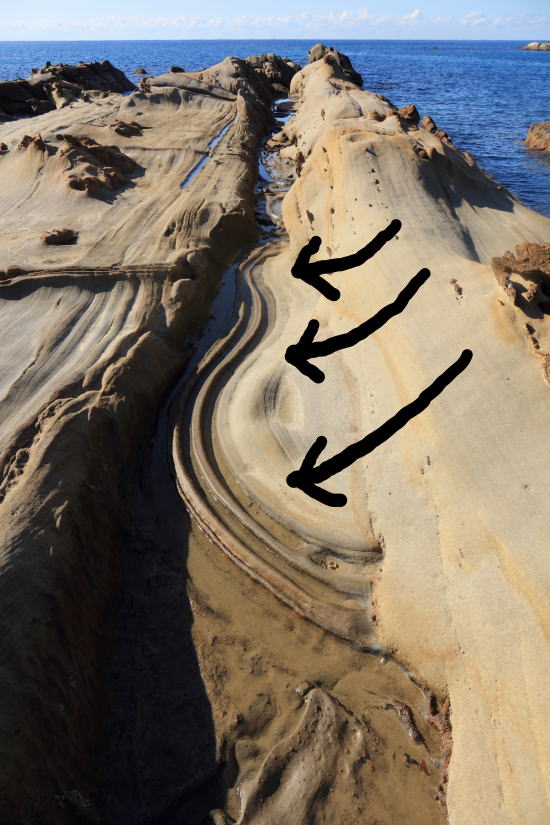 下記の写真は固まる前の軟らかい堆積岩が地滑りし、その後、硬化した跡と思われます。