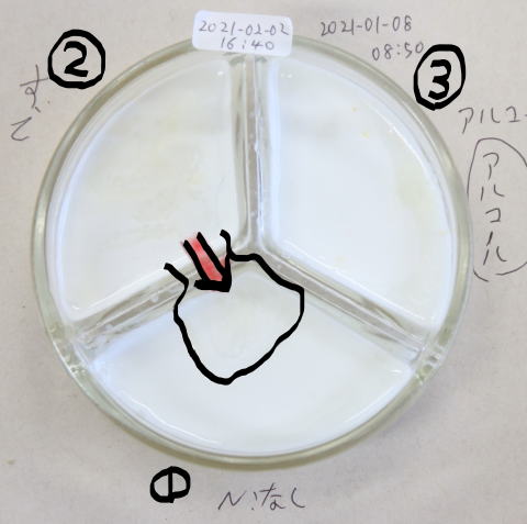 ①:触りなし ②:指で触る ③:アルコールで消毒した指で触る。 培養地は牛乳とゼラチンのみ 実験2回目 7日後 取り出す際①の液が②の方にこぼれた。 |