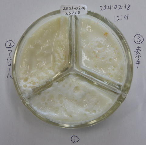 ①:触りなし ②:アルコールで消毒した指で触る。 ③:指で触る。 培養地は卵白と少量の牛乳とゼラチン 実験3回目 12日目 |