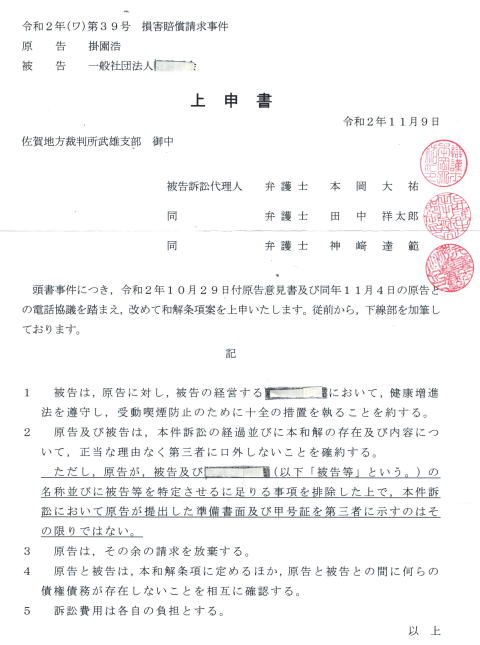 | 屋外での受動喫煙の健康被害の損害賠償請求事件 裁判所が和解案を出し双方がこれに同意。2020年11月20日確定 |