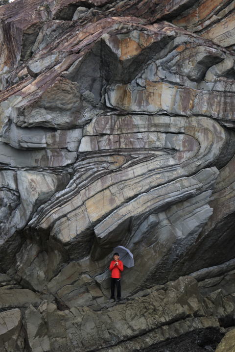 2020-07-25撮影 この断層の存在は知っていましたが、現地には、民家も看板もなく、まともな道もなく、海岸を約2時間さまよってやっと見つけました。 これ程、きれいな断層は非常に稀有です。 三脚を立て自動セルフで撮影。 |