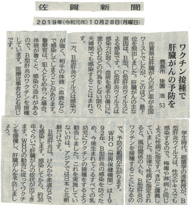 2019年10月28日 佐賀新聞「ワクチン接種で肝臓がんの予防を」
