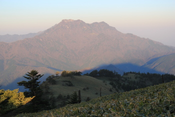 山頂への途中からは西方向に石鎚山と瓶ヶ森の笹の草原が見られます。
