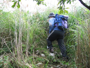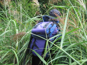 | 「ここに登山道があるよ」と教えてくれる人がいない限り、初めてこの山に登る人には、無理だと思います。 鎌を持って草刈をしながら進む方法もありますが、そんな方法で登山していたら、山頂まで何時間かかるか検討もつきません。 |