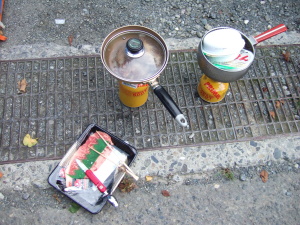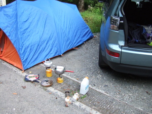 | 前日(9/8)に岩宇土山登山口近くの空き地まで、車で移動してテントを張り、ただ今朝食の準備。 | ||