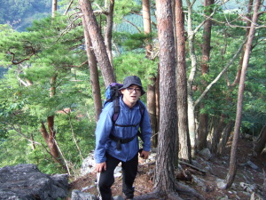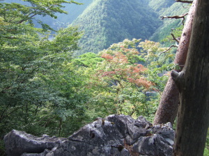 | 登山口からやせ尾根の急登を登った所の景色です。 | ||