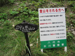 | 岩宇土山・上福根山登山口 しかし、山頂に向う登山道が見つかりません。 右記の標示にもあるように、台風で登山道が崩壊して、その場所に草が生い茂り全くわかりません。 |