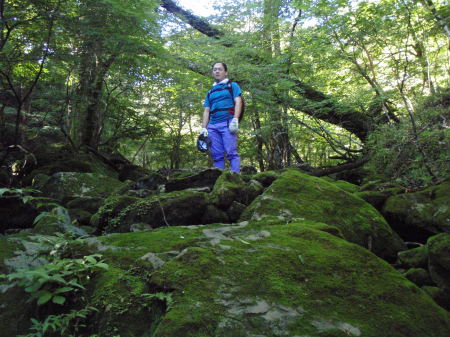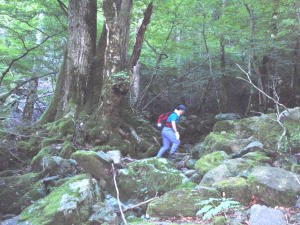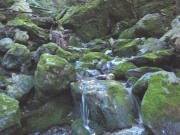 | この谷は両側を山と樹木が覆っているため、薄暗く感じます。谷の樹木はすべて原生林です。(巨木も点在しています。) 谷の岩には、驚くほど見事に苔が生えています。