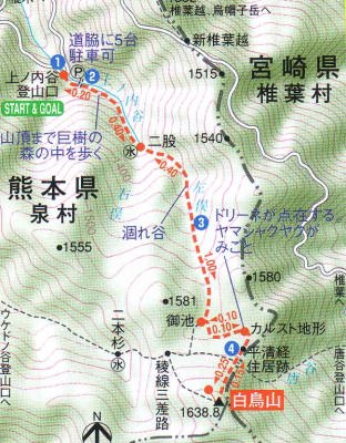 2008年07月27日(日) 白鳥山(1638.8m) コースの案内 地図では、上ノ内谷登山口(登山現場には、御池登山口と表示?) |