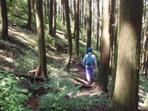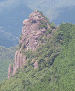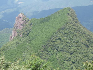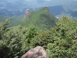 登山道の露出岩から名物「カニのハサミ岩」が見えます。