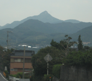長崎県川棚町の車内から撮影した虚空蔵山(こくぞうさん)そびえる鋭鋒が特徴的