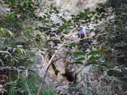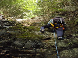 | 枯れた滝つぼらしきものがある3ピッチ目の岩です。 私はこの岩を登るとき無理な姿勢で足がつりました。 |