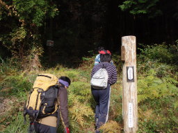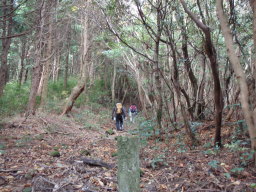 | 佐賀県と長崎県との県境を歩きます。 中央の長方形の石が県境を表す標識です。 佐賀県側は自然林で、長崎県側は造林です。 |