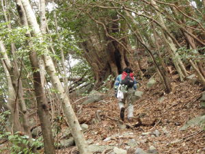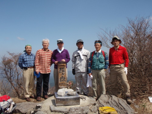 | 経ヶ岳山頂です。 一緒にいた人も記念に写真撮影しました。 山頂の樹木が不法に伐採されていました。 伐採によって展望はよくなりましたが、 見事なマンサクの木も一緒に切られていました。 伐採すると土砂の流失が発生します。 樹木を勝手に切らないようにして下さい。 |