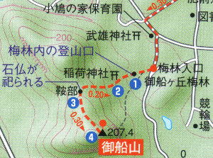 登山ルート案内 梅林入口前に無料の駐車場あり。 等高線の200mという表示に疑問(誤り?)がありますが・・・ 等高線の間隔を20mとすると、御船山は260m以上? 10mとしても230m以上? 地図は誤りが多いので、絶対地図が正しいと思わない方が賢明です。 |