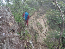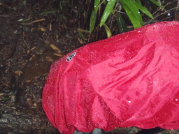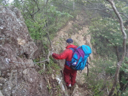 | 標高1400m付近で突然、雷と強風の冷風が吹き始め、 バタバタと音をだして、霰(あられ)が降って来ました。 そして豪雨です。 荷物が濡れないようにザックカバー(ビニールの袋)を 被せます。 |