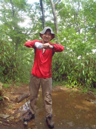 | 今まで、暑かったのが、豪雨で一気に気温が下がりました。 全身びしょ濡れです。 登山道は小川のようになっています。 豪雨は20分程度で止みました。 |
