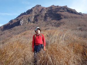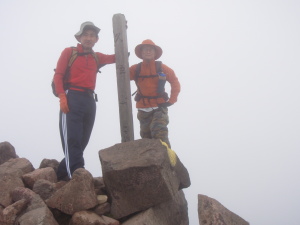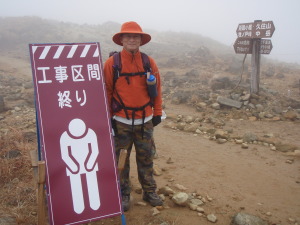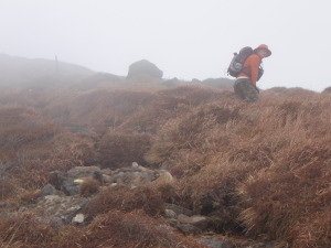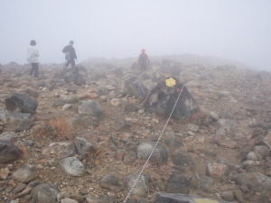 ガスで登山道を間違わないように黄色の表示や登山道に沿ってロープが張られています。